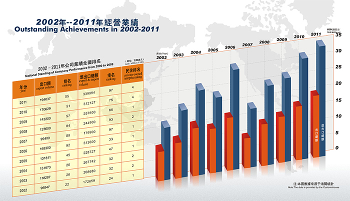 近年來(lái),公司發(fā)展勢(shì)頭良好, 2014年公司實(shí)際出口額達(dá)到10.5億美金,排名“2014中國(guó)出口200強(qiáng)”第192名,其中民營(yíng)企業(yè)排名第21名。公司先后獲得 “中國(guó)守合同重信用企業(yè)”、 “廣東省先進(jìn)集體”、“廣東省優(yōu)秀民營(yíng)企業(yè)”、“東莞市50強(qiáng)民營(yíng)企業(yè)”,“東莞市文明單位”等稱(chēng)號(hào),公司被東莞市政府授予“東莞市50強(qiáng)民營(yíng)服務(wù)業(yè)企業(yè)”光榮稱(chēng)號(hào),公司董事長(zhǎng)陳海生被授予“東莞市優(yōu)秀民營(yíng)企業(yè)家”光榮稱(chēng)號(hào)。